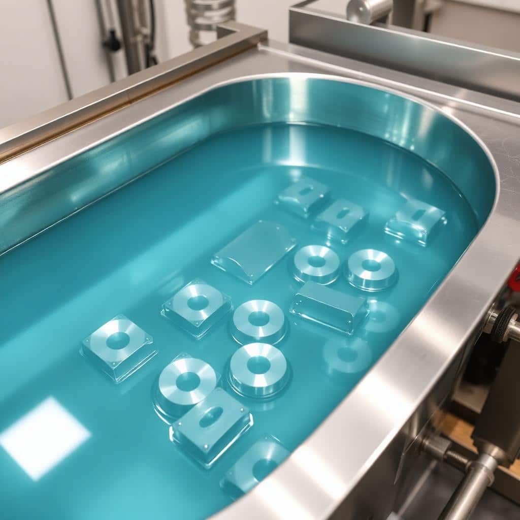 Parts immersed in phosphoric-nitric acid bath at elevated temperature. Chemical reaction dissolves surface irregularities, creating mirror-like finish. Critical step requiring precise temperature and time control.